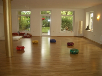 Spiegelwand, Musikanlage, Meditationskissen, Wolldecken, Matratze und